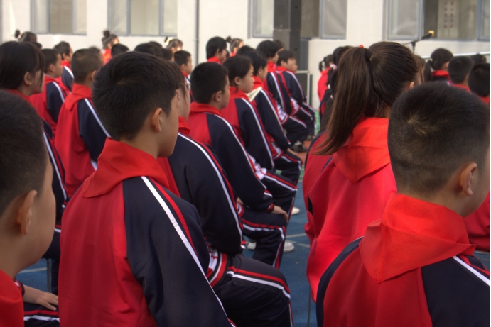戴着红领巾的小学生们坐在老头解开奶罩吸奶头高潮视频爱心学校的操场上 (朱泽雅 摄)