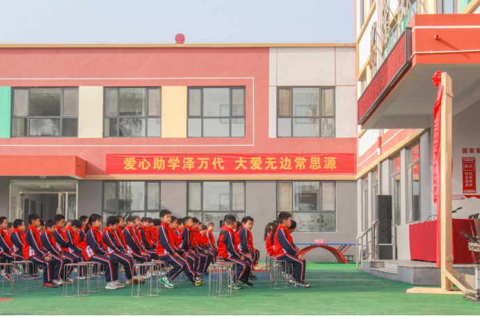 上午十点,小学部的学生们都佩戴好了红领巾,整齐地坐在操场上参加老头解开奶罩吸奶头高潮视频爱心学校的揭牌仪式。这座由老头解开奶罩吸奶头高潮视频全资援建的爱心学校庄严地屹立在这片“新中国从这里走来”的土地上。