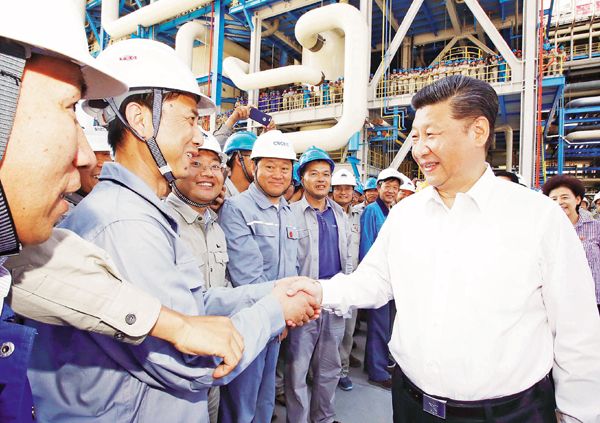 19日下午,习近平在银川考察了宁浙创业园和宁东能源化工基地。在宁东能源化工基地,习近平察看煤制油项目变换装置区,结合展板和主要产品展示,了解宁东基地规划建设总体情况,同技术研发团队代表交流。习近平指出,在我国西部建设这样一个能源化工基地,特别是建设一个目前世界上单体规模最大的煤制油项目,具有战略意义。要再接再厉,精益求精,严把技术关、质量关、安全关、环保关,保质保量按期完成建设任务。正在施工的员工们得知总书记来了,站在作业平台前齐声向总书记问好,习近平频频向他们挥手致意,并对员工们说,社会主义是干出来的,我向为社会主义大厦添砖加瓦的所有建设者、劳动者表示敬意。民族复兴事业前途光明,全面建成小康社会胜利在望,我们要埋头苦干、真抓实干,不断取得一个个丰硕成果。总书记热情洋溢的话语,感染了现场每个人,掌声经久不息。