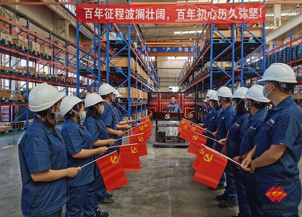 图为物资公司保税库员工在库房收看庆祝中国共产党成立100周年大会盛况